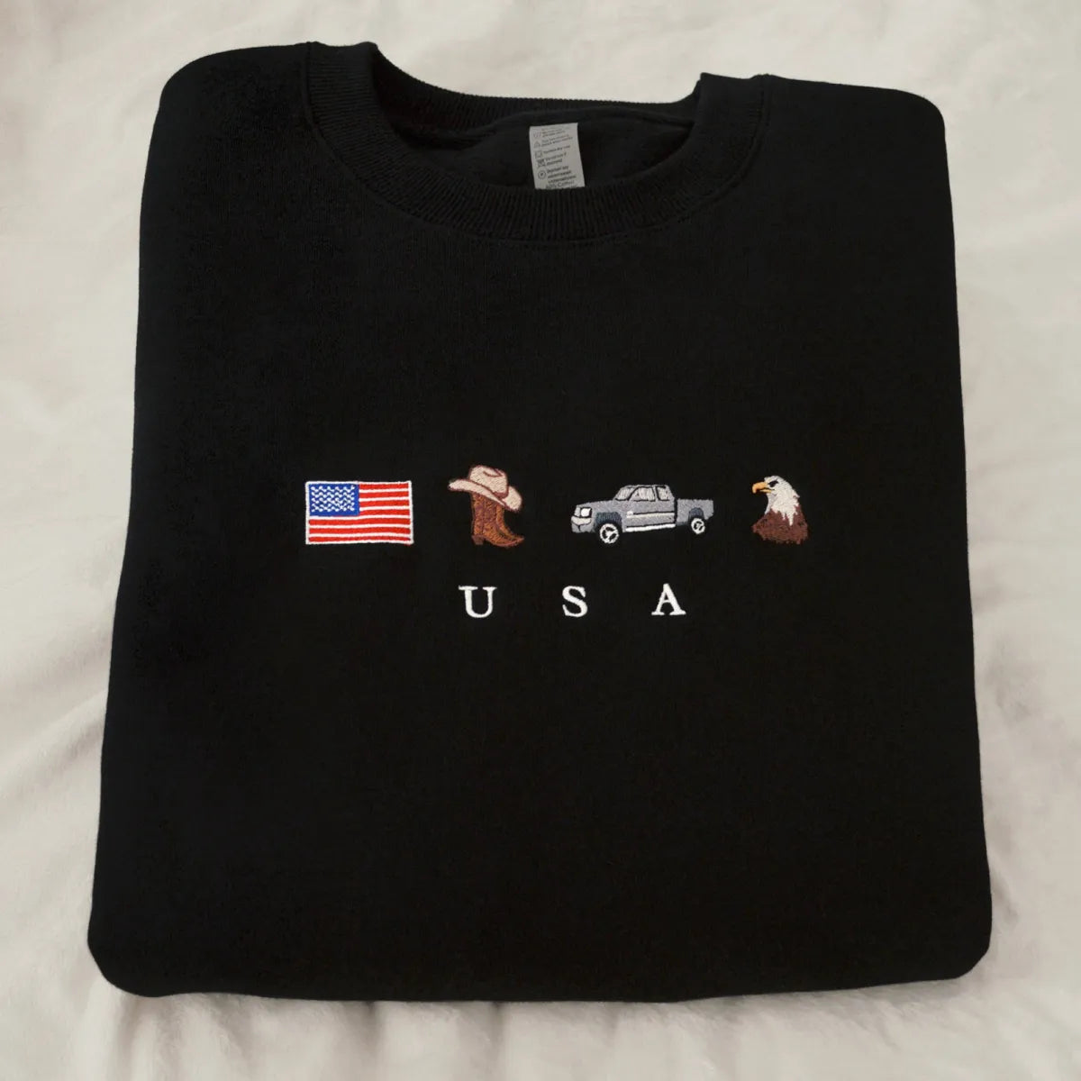 Celebrate the American spirit with our American Flag Embroidered Hoodie a cozy tribute to the red white and blue. This patriotic sweatshirt features a detailed design of the U.S. flag cowboy gear a classic truck and a bald eagle capturing the essence of life out West and Independence Day pride. Crafted on a premium Gildan hoodie this sweatshirt is designed for lasting comfort. The midweight fabric is ideal for breezy nights BBQs or road trips. The bold patrioticUSAletters add a stylish touch. Whether youre at a parade watching fireworks or simply showing your American pride this timeless piece is perfect for all occasions. Add your own twist by customizing the sleeve or wear it as it is either way youre embodying American style.
