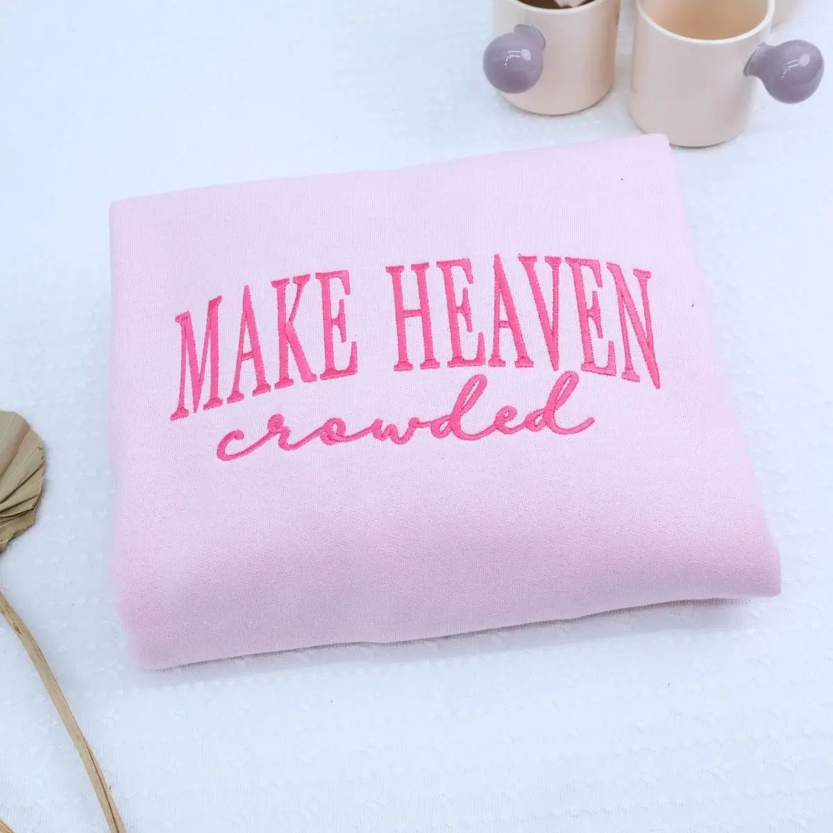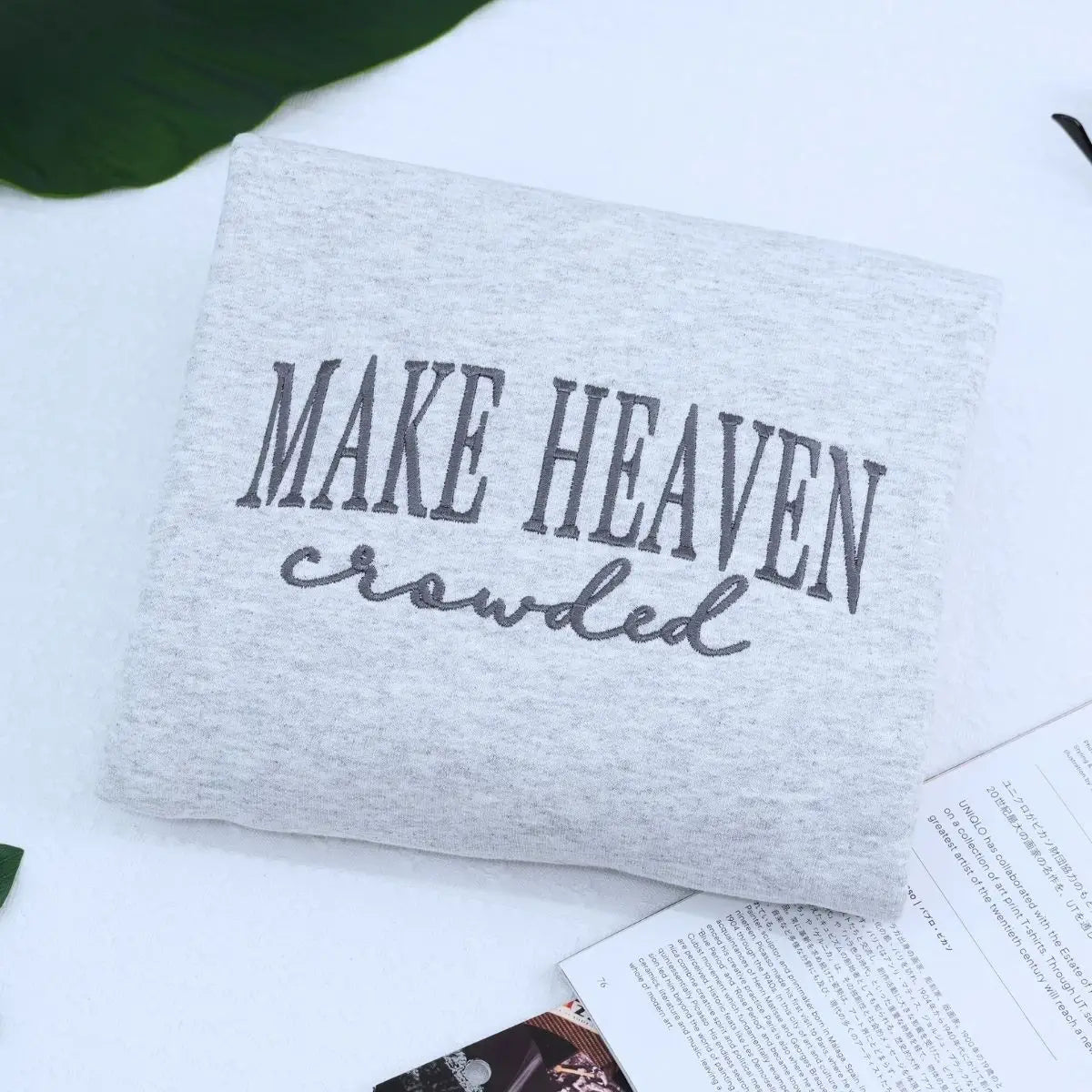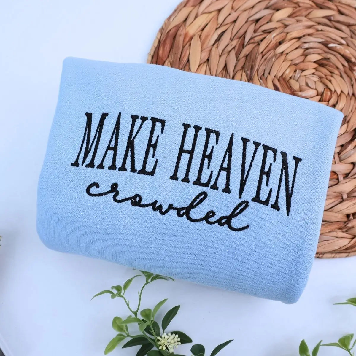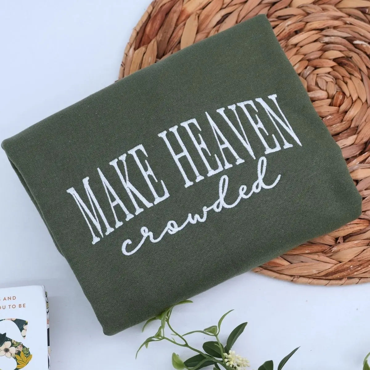 Declare your faith boldly with this premium embroidered sweatshirt. Stay warm and comfortable while spreading love and light everywhere you go. Perfect for gifts or personal wear this unisex piece features a faith forward message proudly stitched on its fabric. Feel the warmth and encouragement daily with this meaningful Christian garment that stands out in any setting. Get yours today and join the movement to Make Heaven Crowded.