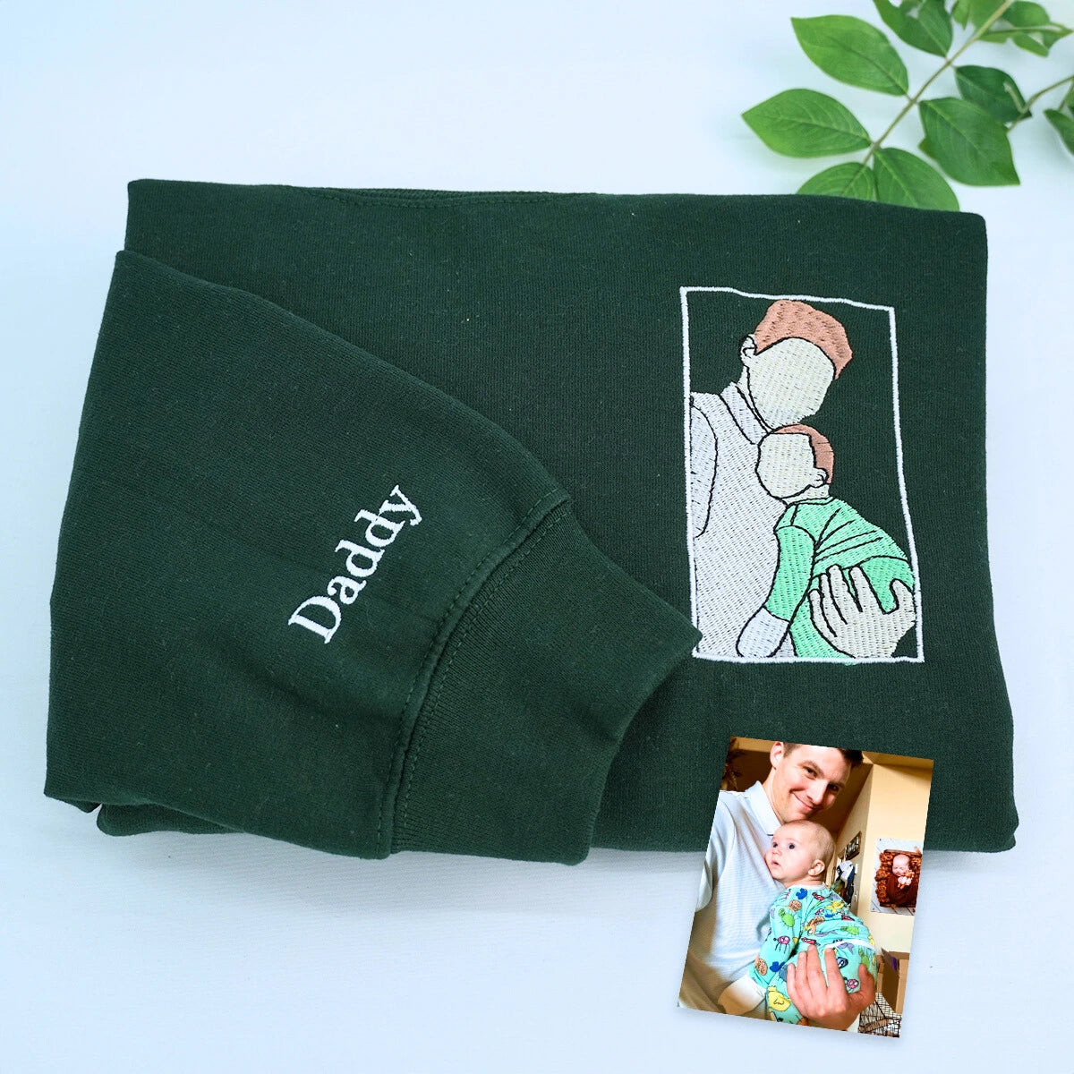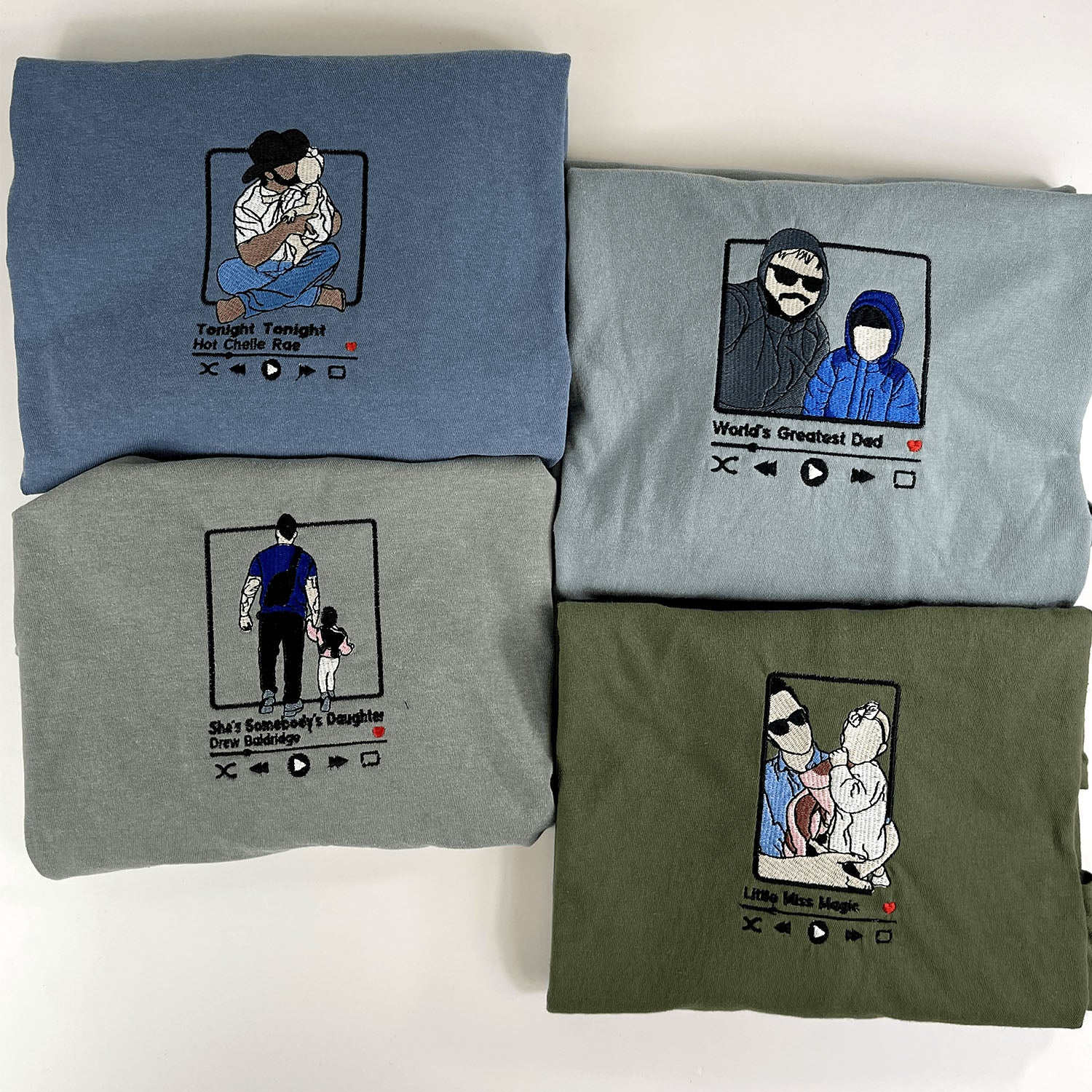 Show your love with our personalized Dad and Son T shirt gift set featuring an embroidered photo portrait. This special shirt symbolizes the unbreakable bond between father and son. Make memories last with this unique Fathers Day or birthday present that both of you will cherish forever.